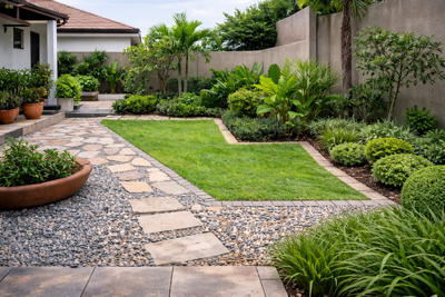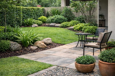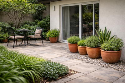 plantes locales résistantes, bordures pour limiter l’envahissement, et surfaces minérales faciles à nettoyer.