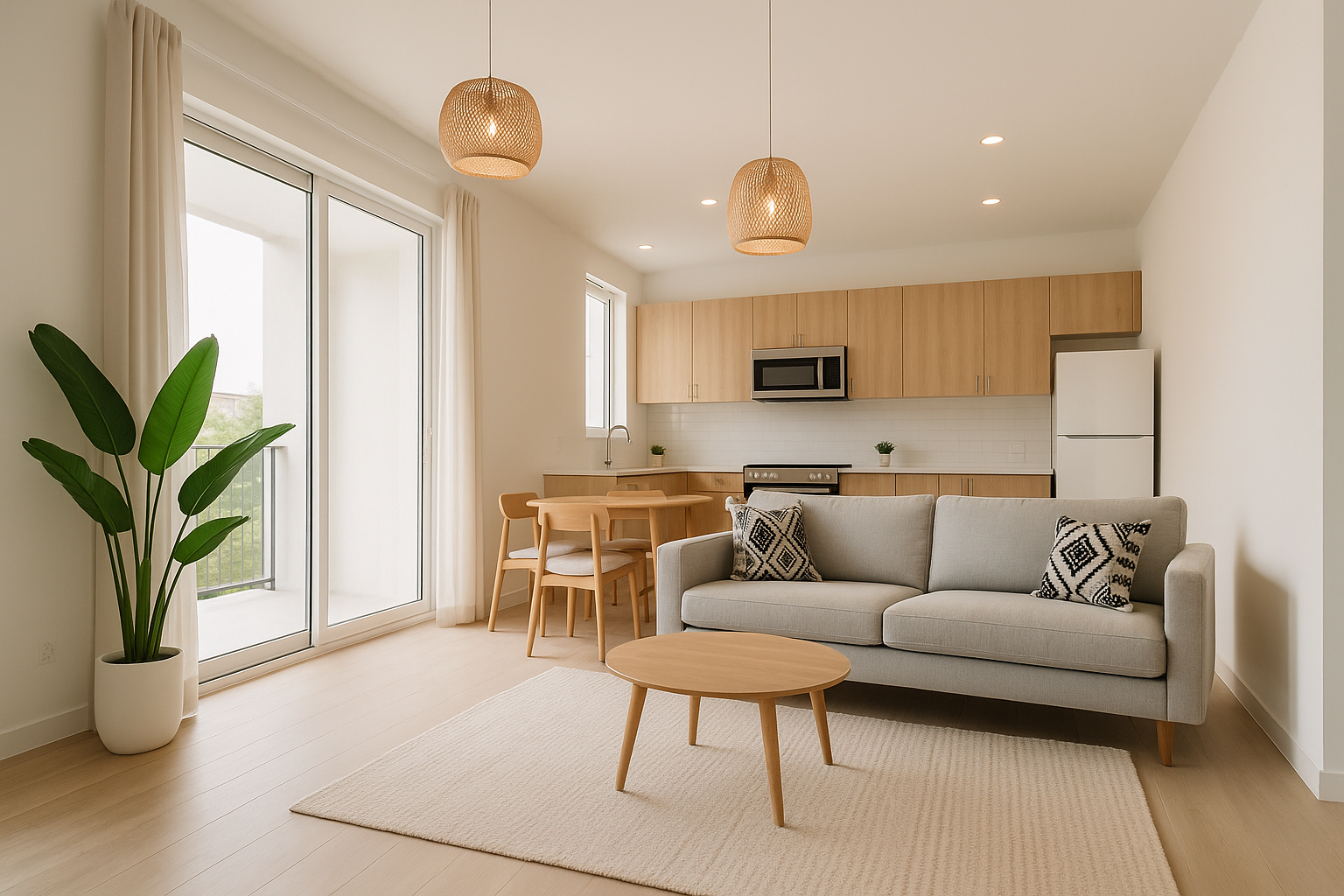 Scandinave tropical : bois clair + rotin + blanc + plantes