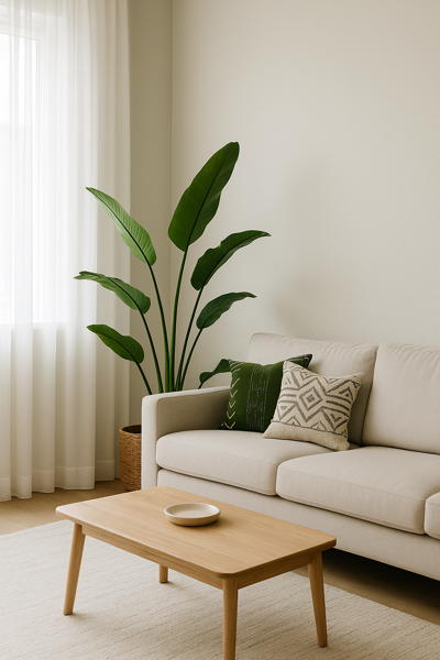des meubles simples, des éléments décoratifs durables, des plantes naturelles et une